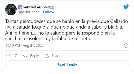 El Muñeco en conferencia fue claro sobre el marco del encuentro:“No había nada previo… previo para ustedes capaz, para mí no tuvo nada de especial o algodiferente a cómo vivo cada partido”. Sin embargo, en las redes se encargaron de dejar en claro cuál fue la respuesta del DT.