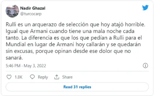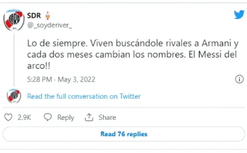 Se trata de Franco Armani, que llegó a ser TT N°1 tras los errores de Gerónimo Rulli bajo los tres palos. El Pulpo, que pelea un lugar en el Mundial con el ex-Estudiantes, fue mencionado por todos los hinchas de River, que sacaron pecho por el arquero que tantas alegrías le dio.
