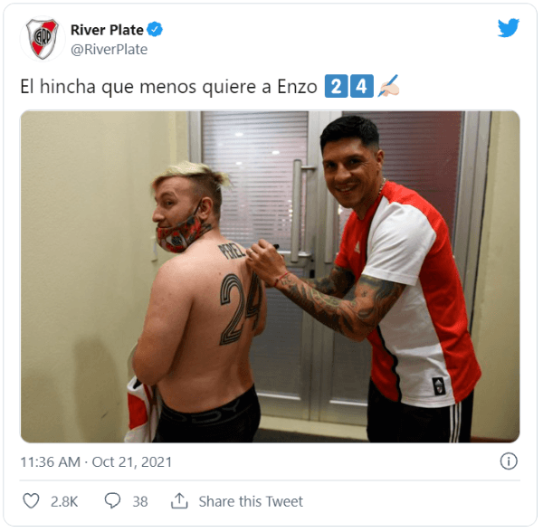 La cuenta oficial de River compartió la imagen en su cuenta de Twitter. Un hincha del Millonario se tatuó la casaca de Enzo, con la misma tipografía que usó el día que fue arquero ante Independiente Santa Fe por la Copa Libertadores. El mediocampista se acercó para firmar la obra de arte.