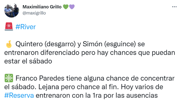 A raíz de esta situación, el entrenador de River está pensando en darle la posibilidad al lateral derecho Franco Paredes. Según indicó el periodista de TNT Sports, Maximiliano Grillo, el capitán de la Reserva“tiene alguna chance de concentrar el sábado. Lejana pero chance al fin. Hoy varios de Reserva entrenaron con la 1ra por las ausencias”.