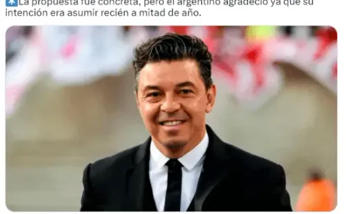 Según informó el periodista César Luis Merlo, Gallardo agradeció y rechazó la propuesta porque su idea es volver a las canchas recién a mitad de año. El DT no tiene pensado volver antes de tiempo, salvo que se aparezca una oferta completamente irrechazable.