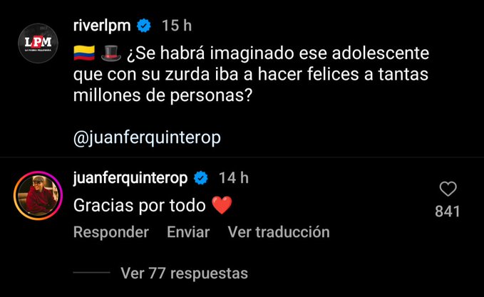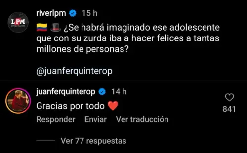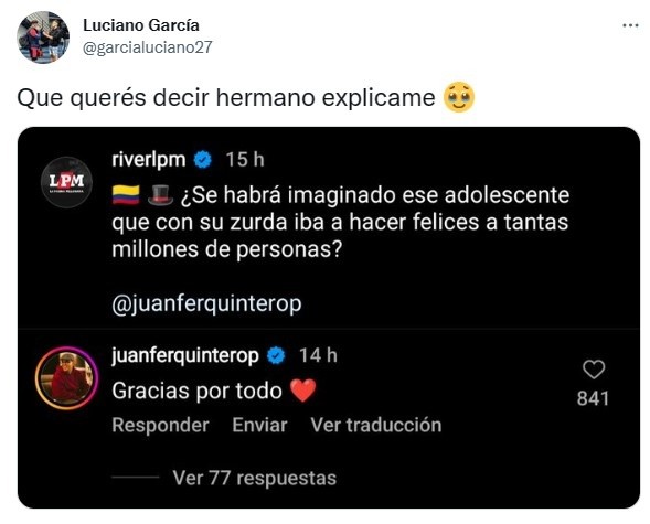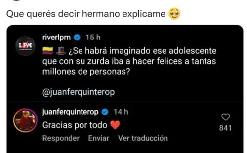 En ese contexto, el reconocido portalLa Página MIllonariale dedicó un sentido posteo a Juanfer ante la posibilidad de que no vuelva a jugar en River. “¿Se habrá imaginado ese adolescente que con su zurda iba a hacer felices a tantas millones de personas?”, decía la publicación que, finalmente, Quintero terminó por contestar.