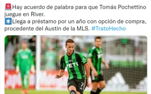 La Banda se movió rápidamente en silencio y, a pocos días de conocerse el interés por el mediocampista que debutó en Boca en 2015, César Luis Merlo informó en sus redes sociales que ya existe un acuerdo entre elAustin FC y River para que Pochettino se ponga la camiseta rojiblanca a partir de 2022. “Llega a préstamo por un año con opción de compra”, indicó el periodista experto en el mercado de pases. Papá Noel tardó en llegar, pero finalmente le dejó su regalo a Gallardo.