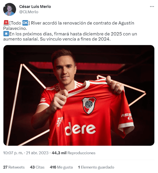 Según informó el periodista César Luis Merlo, “en los próximos días se firmará”. Si bien hoy no es titular con Martín Demichelis, puertas adentro es considerado un jugador importante y con chances de ganarse un lugar de cara al futuro. Para el exigente calendario, será importante contar con la mayor cantidad de futbolistas posibles.