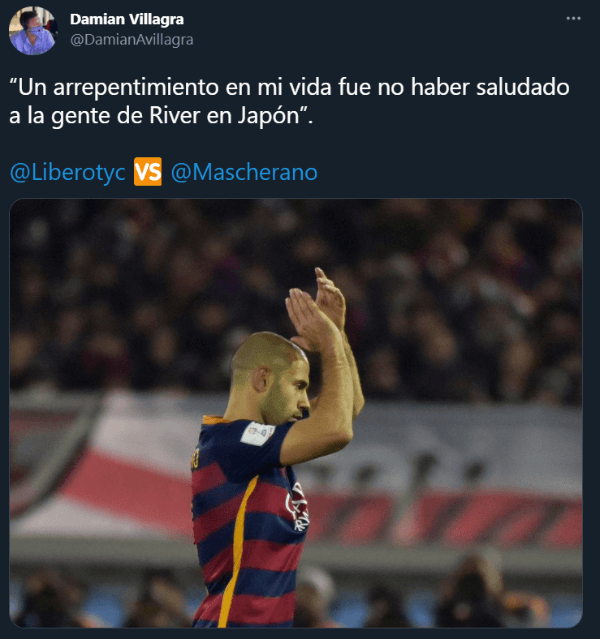 “Un arrepentimiento en mi vida fue no haber saludado a la gente de River en Japón”, exteriorizó Mascherano en declaraciones brindadas a ‘Líbero’, por TyC Sports. Cabe destacar que el ‘Jefecito’, debutó con la camiseta Millonaria en 2003 y se mantuvo allí hasta 2005, aportando una anotación al cabo de 72 compromisos de carácter oficial.
