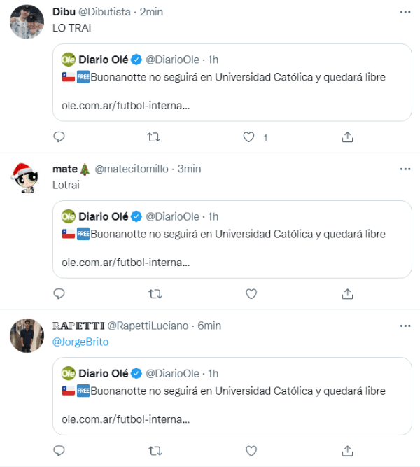 Según informaron medios trasandinos, Diego Buonanotte rechazó la última oferta para renovar su contrato con la Universidad Católica y saldría al primer mercado de 2022 en condición de jugador libre. El oriundo deTeodelina conquistó trofeos de todos los colores en los “Cruzados” y es considerado un ídolo de la institución, ratificando su gran nivel futbolístico en los últimos años. Teniendo en cuenta que el “Enano” fue compañero de Gallardo en la última etapa de “Napoleón” en River, ¿habrá un llamado para enero?