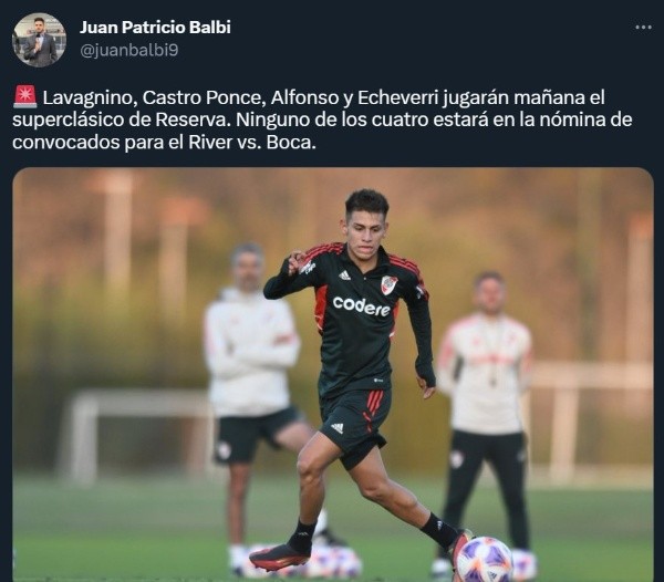 A través de su cuenta de Twitter, el periodista Juan Patricio Balbi confirmó que “Lucas Lavagnino, Tomás Castro Ponce, Franco Alfonso y Echeverri jugarán mañana (sábado) el Superclásico de Reserva”. Y añadió: “Ninguno de los cuatro estará en la nómina de convocados para el River vs. Boca”.