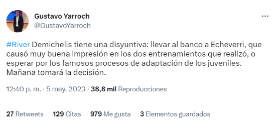 Hay dos opciones: “llevar al banco a (Claudio) Echeverri, que causó muy buena impresión en los dos entrenamientos que realizó, o esperar por los famosos procesos de adaptación de los juveniles”. ¿Hay un lugar para que el Diablito vaya al banco? “Mañana tomará la decisión”, confirmó el corresponsal.