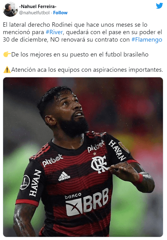 “Después de nuestra decisión de irnos de Flamengo, River mostró interés por Rodinei. Primero queremos jugar la final de la Libertadores y ser campeones”, declaró Ricardo Scheidt. La final de la Copa será este fin de semana, con Rodinei como protagonista y candidato a dar la vuelta olímpica como en 2019, doloroso recuerdo para River.