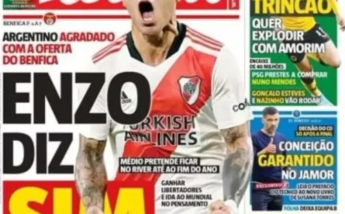 El diario Récord de Portugal, uno de los más prestigiosos en el país luso en lo que a deportes respecta, tituló en su tapa de este jueves la noticia de que Enzo Fernández “le dijo que sí” a la oferta del Benfica y que el volante “está satisfecho con la oferta“, claro está que hablando a nivel contractual. De hecho, se hizo oficial hace instantes que el director deportivo del conjunto de Lisboa estará en el Monumental viendo a Enzo Jr.