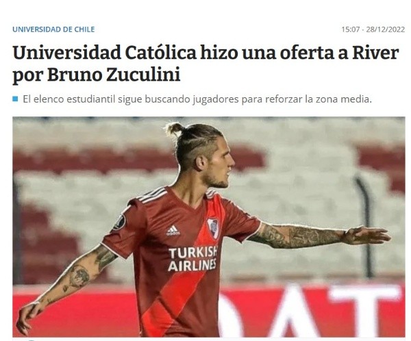 Bruno Zuculini fue uno de los aclamados por el nuevo DT de River cuando el volante expresó su voluntad de permanecer en el club, pero desde el exterior pretenden llevárselo en este mismo mercado. La Universidad Católica que dirige Ariel Holan insistepor el ex Manchester City desde hace varias semanas y, pese a la firme postura de Demichelis en querer retenerlo, una tentadora propuesta económica podría desencadenar la salida del mediocampista.