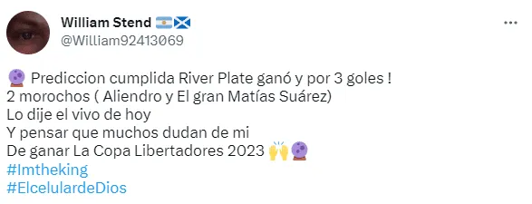 “Prediccion cumplida River Plate ganó y por 3 goles ! 2 morochos (Aliendro y El gran Matías Suárez) Lo dije el vivo de hoy. Y pensar que muchos dudan de mi. De ganar La Copa Libertadores 2023.#Imtheking #ElcelulardeDios”, posteó, dando a entender que el Millonario es candidato a la Copa Libertadores de este año.