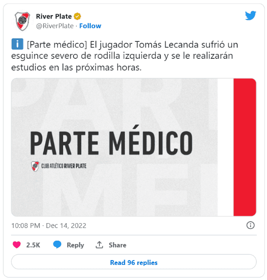 Cuando parecía que la práctica del Millonario se había completado sin mayores inconvenientes, en las redes sociales del club salió un parte médico de última hora. “Esguince severo de rodilla izquierda”, indica el comunicado que compartió el Millonario.