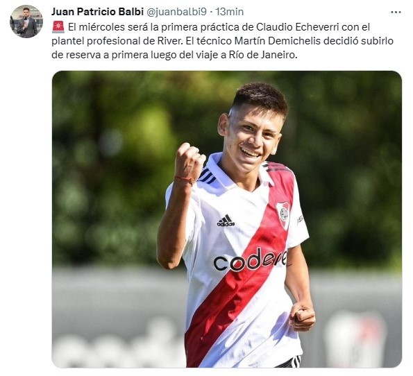 La última comunicación de Demichelis con el juvenil se dio en las últimas horas y ya se le confirmó cuándo va a empezar a trabajar a la par del grupo. “El miércoles será la primera práctica de Claudio Echeverri con el plantel profesional de River. El técnico decidió subirlo de Reserva a Primera luego del viaje a Río de Janeiro”, informó el periodista de ESPN, Juan Patricio Balbi.