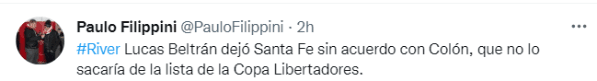 MientrasRiverpuja por hacerse de delanteros de jerarquía, la particular situación deLucas Beltránno deja de ser una de las prioridades a pocos días de la reanudación de la CONMEBOL Libertadores. Colón no tiene intención de interrumpir el préstamo antes del 30 de junio y continúa firme con su postura de anotarlo en la lista del certamen continental. ¿Se destraba?
