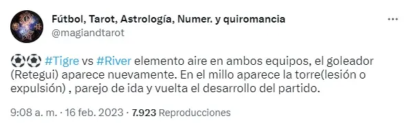“Tigre vs River elemento aire en ambos equipos, el goleador (Retegui) aparece nuevamente. En el millo aparece la torre(lesión o expulsión) , parejo de ida y vuelta el desarrollo del partido”, predijo el tarotista.