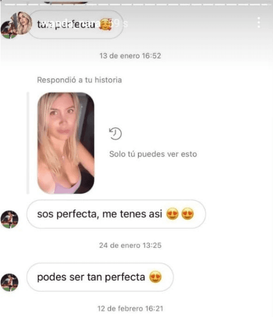 La modelo y agente publicó en sus “stories” diversas capturas de pantallas de sus chats y una de ellas le correspondía a Esequiel Barco, el talentoso volante que tiene el equipo de Marcelo Gallardo. Con mensajes algo subido de tono, el jugador se convirtió en primera tendencia en Twitter junto a la pareja de Mauro Icardi y la farándula posó sus ojos en dicha situación que se produjo el lunes por la noche.