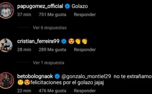 El miércoles, Gonzalo Montiel convirtió su primer gol con la camiseta del Sevilla y expresó su alegría en Instagram, donde el actual arquero suplente de River, Enrique Bologna, bromeó con él en los comentarios de la foto.