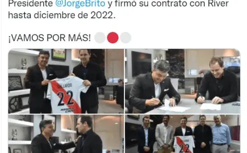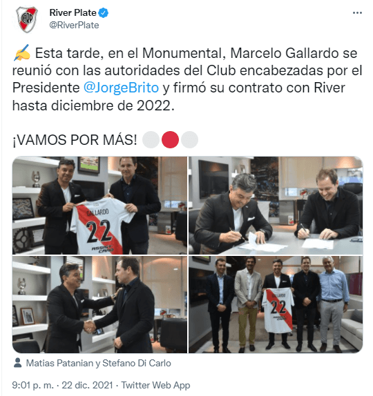 En la cuenta oficial de River se publicaron las cuatro primeras imágenes del entrenador tras haber firmado su nuevo contrato con el club de sus amores. “Esta tarde, en el Monumental, Marcelo Gallardo se reunió con las autoridades del Club encabezadas por el Presidente @JorgeBrito y firmó su contrato con River hasta diciembre de 2022. ¡VAMOS POR MÁS!”, escribieron. ¡Increíble!