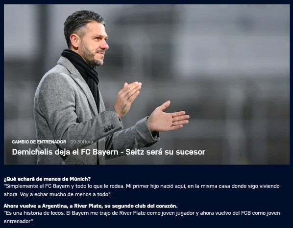 Inmediatamente después del anuncio, el campeón de la Bundesliga hizo pública una entrevista exclusiva con Micho en la cual repasó su trayectoria en las formativas del Bayern y, por supuesto, su nuevo desafío al reemplazar a Marcelo Gallardo en La Banda.