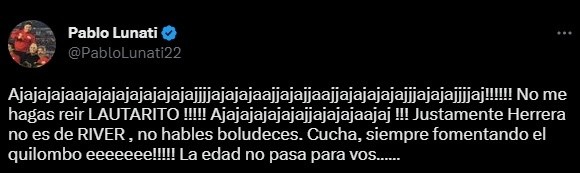 En un tuit muy al estilo del ex referí de Santos Lugares, Lunati aseguró que Darío Herrera “no es hincha de River” y además acusó al Laucha de ser un jugador problemático: “No hables boludeces. Cucha, siempre fomentando el quilombo eeeeeee!!!!! La edad no pasa para vos”, picanteó el Loco.