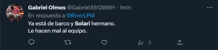 Más allá de las ocasiones de gol que se malograron a lo largo de los 90 minutos, los hinchas de River se hicieron sentir a través de las redes sociales, ya que no toleraron que Martín Demichelis sostuviera dentro del campo de juego a Pablo Solari. El ex delantero de Colo-Colo no tuvo un buen desempeño, y aún no logra encontrar el nivel que mostró durante sus primeros encuentros con la banda roja en el pecho.