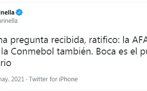 “Ante alguna pregunta recibida, ratifico: la AFA es bostera. Y la Conmebol también. Boca es el puto amo del escritorio“, escribió Farinella, quien, nadie sabe por qué, metió alXeneizeen el medio de la disputa a nivel continente. Sí, no se salvaron ni la Asociación del Fútbol Argentino (AFA) ni la Confederación Sudamericana de Fútbol (Conmebol).