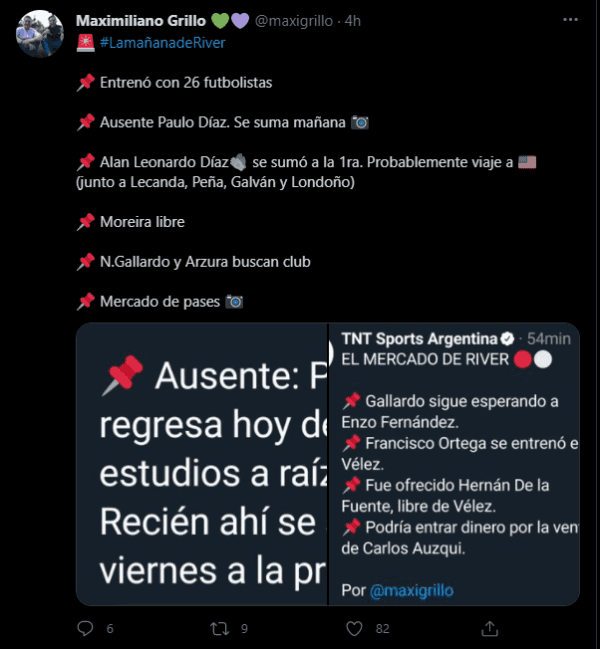 Son 26 los jugadores quese entrenaron hoy en el River Camp de Ezeiza para el equipo Millonario y llamaron la atención dos situaciones, una relacionada a una presencia y la otra a ausencias: el arquero Leonardo Díaz se entrenó a la par de todo el equipo y faltaron dos jugadores que ya volvieron de sus préstamos pero no se entrenaron con River, que fueron Joaquín Arzura y el hijo del Muñeco, Nahuel Gallardo.