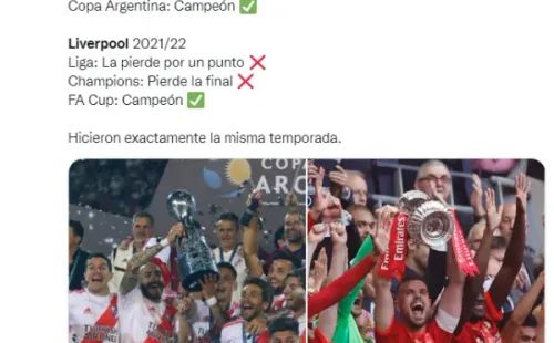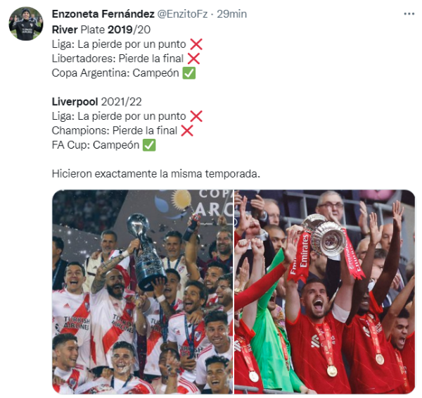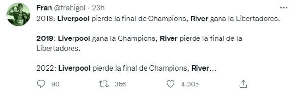Sin embargo, pese al triste recuerdo de viejos tiempos, los hinchas del Millo se apoyaron en una curiosa teoría para celebrar la victoria del Real Madrid para lograr su decimocuarta Champions League en la historia. Increíblemente, tanto el Liverpool como River disputaron finales en los mismos años durante la década reciente y sus resultados fueron totalmente opuestos.