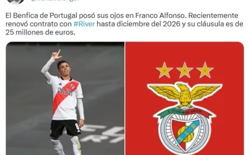 Según lo adelantó el periodista Iván Alvarenga,Benfica se volvió a interesar en un jugador de River: Franco Alfonso. El delantero que hizo debutar Micho en Primera acaba de renovar contrato con el Millonario, con fecha de vencimiento para diciembre de 2026, y el club de Lisboa ya sabe cuánto debe abonar para liberarlo.