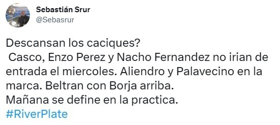 A la espera de los últimos ensayos tácticos, el periodista Sebastián Srur adelanto que varios referentes del equipo podrían empezar el encuentro desde el banco de suplentes para repartir cargas. “Casco, Enzo Perez y Nacho Fernandez no irian de entrada el miercoles”, posteó en su cuenta de Twitter.