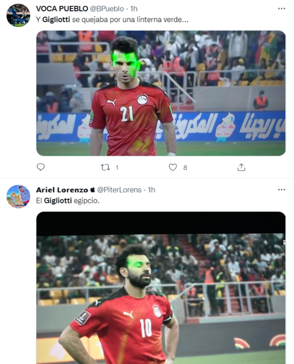 Además de las imágenes del encuentro, lo más llamativo del partido estuvo en las tribunas. Cientos de hinchas senegaleses ingresaron al estado con láseres, en una especie de maniobra colectiva para distraer a los egipcios tanto en el cotejo como en la serie de penales. Los memes acerca de esta curiosidad aparecieron en todo el mundo, pero en Argentina tuvo un uso más que particular.