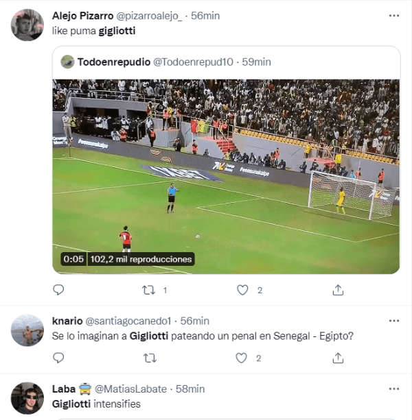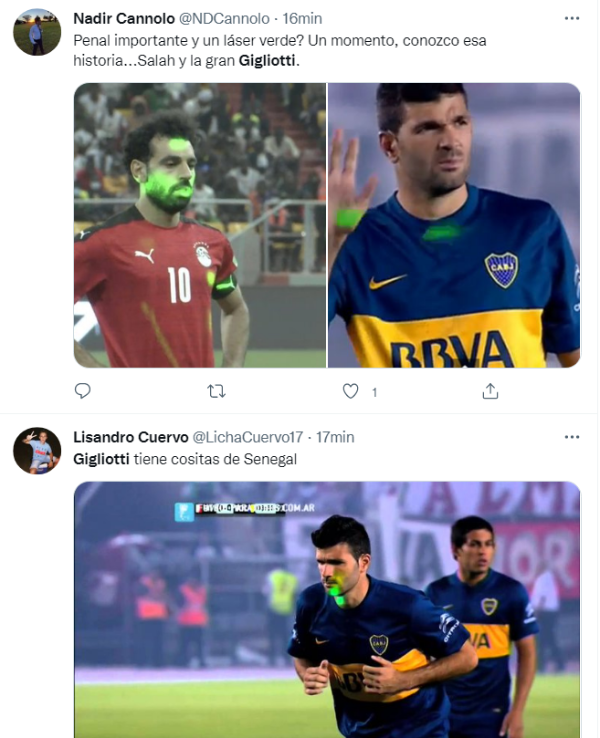 Los hinchas de River trajeron a cuento el partido de vuelta de la serie contra Boca en la Copa Sudamericana 2014, específicamente el penal que tuvo que ejecutar Emmanuel Gigliotti en el inicio del Superclásico. El delantero sufrió el uso del láser antes de su remate, el cual fue atajado por Marcelo Barovero. La imagen se repitió esta tarde con el Senegal-Egipto y en Twitter se acordaron del Xeneize. Que viva el folclore.