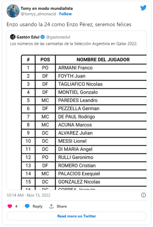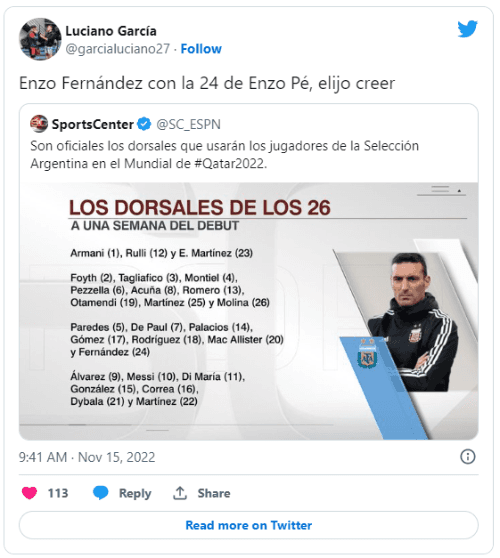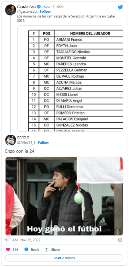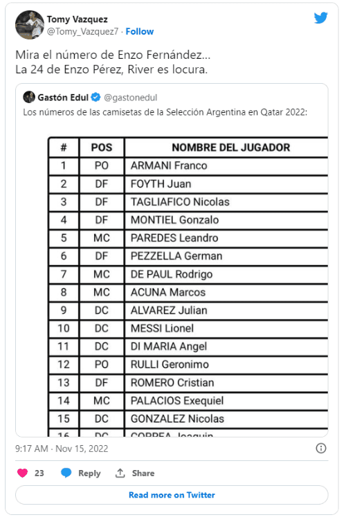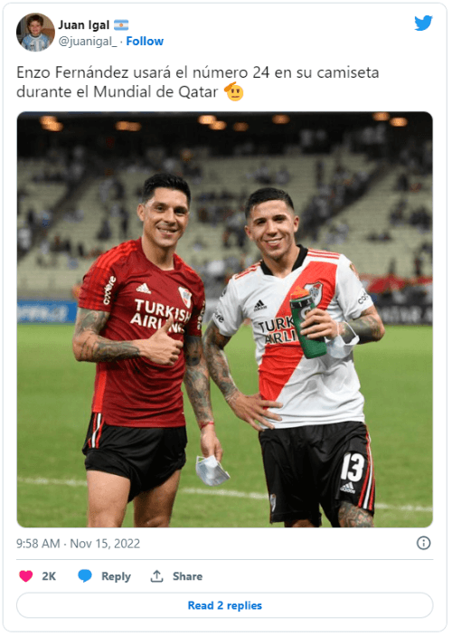 Teniendo en cuenta que la 14 que usó en su debut la agarró Palacios, el mediocampista del Benfica llevará la 24, camiseta que en Núñez se identifica mucho con Enzo Pérez. Una vez publicada la lista que confirmaba los dorsales, los simpatizantes del Millo sacaron pecho.