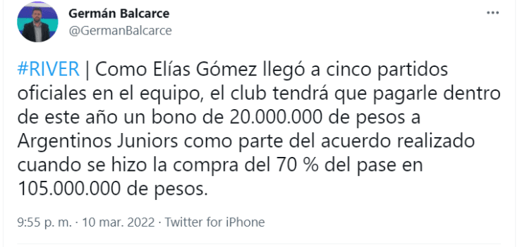 SegúnGermán Balcarce, periodista que cubre el día a día de River, “como Elías Gómez llegó a cinco partidos oficiales en River, el club tendrá que pagarle dentro de este año un bono de 20.000.000 de pesos a Argentinos Juniors como parte del acuerdo realizado”. Vale destacar que el Millo compróel 70 % del pase en 105.000.000 de pesos.
