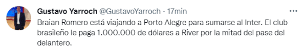 De una forma similar en la que llegó aRiver, con una operación fugaz y en silencio, Braian Romero concretó su salida del club en las últimas horas. El exdelantero de Defensa y Justicia será nuevo jugador del Inter de Porto Alegre en las próximas horas y ya está viajando a Brasil para poner la firma.