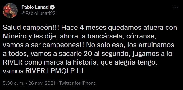 “¡¡¡Salud campeón!!! Hace 4 meses quedamos afuera con Mineiro y les dije, ahora a bancársela, córranse, vamos a ser campeones”, escribió Pablo. Y agregó: “No solo eso, los arruinamos a todos, vamos a sacarle 20 al segundo, jugamos a lo RIVER como marca la historia. Qué alegría tengo, ¡¡vamos RIVER LPMQLP!!”.