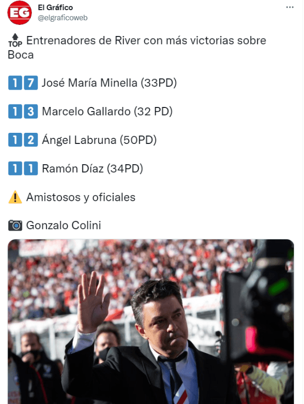 Además de homenajearlo, Marcelo Gallardo también ha superado a “Angelito” en una tabla histórica de los Superclásicos. Con el triunfo de ayer, el Muñeco dejó atrás a Labruna y se ubica como el segundo entrenador de River que más veces le ha ganado a Boca en duelos oficiales, con 13 victorias en 32 encuentros.