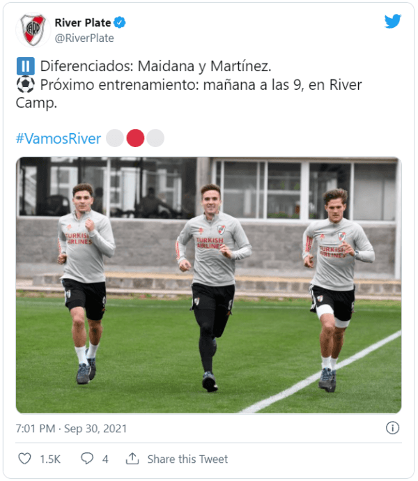 El equipo que probó el Muñeco fue con Franco Armani; Milton Casco, Robert Rojas, Paulo Díaz, Fabrizio Angileri; Enzo Fernández, Enzo Pérez, Nicolás De La Cruz; Jorge Carrascal; Julián Álvarez y Braian Romero. De todas formas, con Gallardo habrá que esperar hasta último momento.