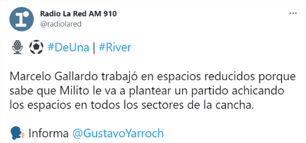 “Marcelo Gallardo trabajó en espacios reducidos porque sabe que Milito le va a plantear un partido achicando los espacios en todos los sectores de la cancha”, dijo Gustavo Yarroch en Radio La Red revelando la gran estrategia que prepara el Muñeco para seguir en carrera a nivel continental. Veremos si le funciona.