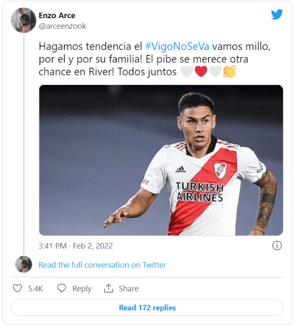 Se trata de Alex Vigo, que después de un año en el club está por cerrar su salida hacia Independiente. Gallardo le comunicó que no será tenido en cuenta y el propio lateral subió una historia diciendo “prohibido rendirse. Respira hondo y sigue”. Los hinchas del Millonario iniciaron una campaña pidiéndole al Muñeco que le de otra oportunidad.