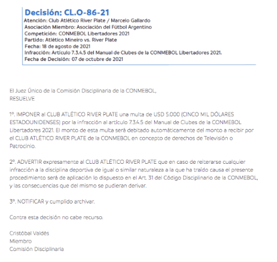 El motivo del castigo es una infracción en la última conferencia de prensa posterior a la eliminación. Por eso, además de la advertencia para el entrenador, se le impuso una multa de 5 mil dólares al club, que será descontada de los derechos televisivos.