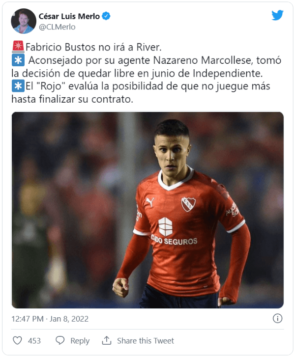 Según informó Germán García Grova, Bustos tomó la decisión de quedarse en Independiente y desestimar la oferta del Millonario. El jugador quiere quedar libre en junio para poder irse con el pase en su poder, pero ahora el Rojo analiza no utilizarlo por estos seis meses que le quedan.