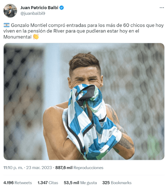 El periodista Juan Patricio Balbi dio a conocer un dato que nadie sabía sobre el 4 del Sevilla: “Compró entradas para los más de 60 chicos que hoy viven en la pensión de River para que pudieran estar hoy en el Monumental”. Sin lugar a dudas, un enorme acto que esos muchachos no se olvidarán en su vida.