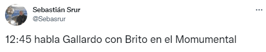 A la hora de hablar ante los micrófonos, Marcelo Gallardo no estará solo. “Habla con Brito”, especificó el exjornalista de TNT Sports para dar a conocer la presencia del presidente del Millonario al lado del actual DT. Esto le da un tono aún más institucional a la cita y podría tratarse de la definición del futuro del Muñeco.
