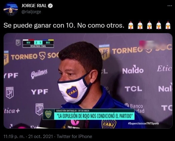 Ni bien finalizó el partido, Jorge Rial, reconocido hincha del Millonario, utilizó su cuenta de Twitter para celebrar el triunfo. Y en el medio se burló de Sebastián Battaglia, el director técnico de Boca. “Se puede ganar con 10. No como otros”, indicó el conductor televisivo.
