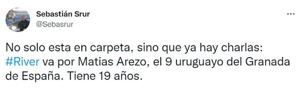 A través de su cuenta de Twitter, el periodista Sebastián Srur manifestó la nueva opción que tienen en los pasillos del Monumental para que tome la posta del nacido en Calchín. “No solo esta en carpeta, sino que ya hay charlas: River va por MatiasArezo, el 9 uruguayo del Granada de España. Tiene 19 años”, indicó el cronista de Radio Continental.
