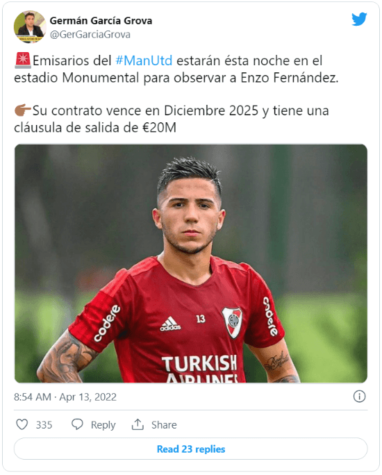En los últimos días se empezó a hablar del Manchester City, que ya se aseguró a Julián Álvarez y empezó a poner los ojos en el volante. Sin embargo, revelaron que emisarios de otro poderoso club inglés irán hoy al Monumental para verlo ante Fortaleza.