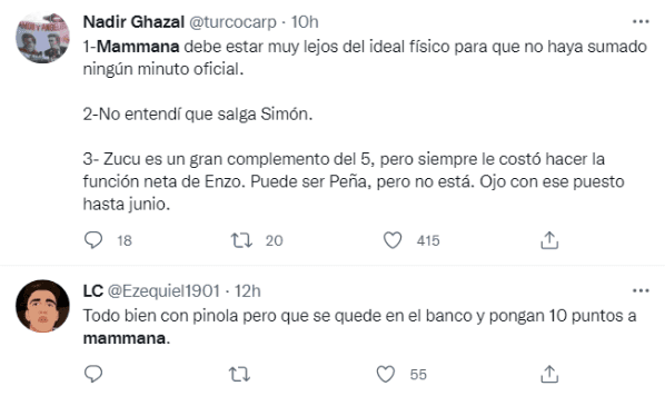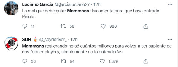 Al momento de las lesiones, el Muñeco decidió mandar a la cancha a Bruno Zuculini y Javier Pinola como reemplazantes. No obstante, los hinchas se hicieron escuchar en redes sociales y expresaron su descontento por la sustitución en la defensa. A pesar de no haber jugado ni un solo minuto en la temporada, Emanuel Mammana estuvo entre las primeras tendencias de Twitter por el reclamo al DT, ya que muchos ansiaban su reestreno oficial en lugar del averiado González Pirez.