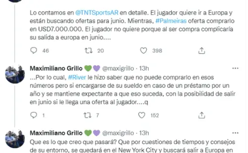 Para concluir con la información, Grillo agregó su pálpito a pocas horas del cierre del mercado en el fútbol argentino: “¿Que es lo que creo que pasará? Que por cuestiones de tiempos y consejos de su entorno, se quedará en el New York City y buscará salir a Europa en junio. River hizo lo que está a su alcance y espera”. ¿Habrá una luz al final del tunel para el Millo?